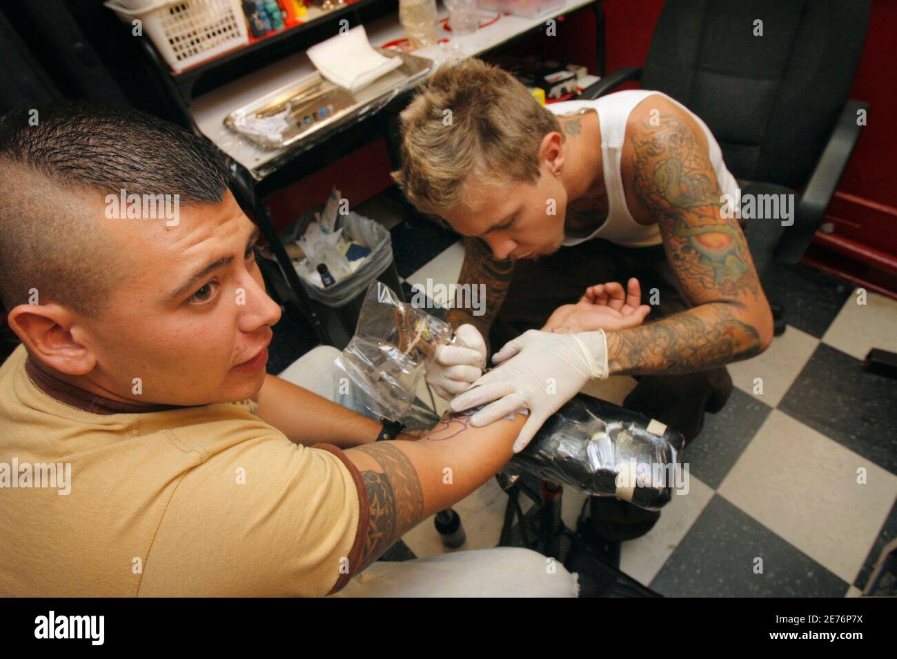 Tattoo Artist Juju Becker R Tattoos The Forearm Of National Guardsman Brian Wood At The Crescent City Tattoo Parlor In The Garden District Of New Orleans Louisiana October 18 2005 With The